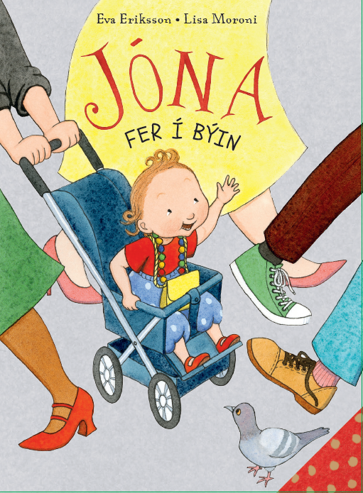 Jóna og mamman skulu í býin at keypa skógvar. Hey bussur! sigur Jóna. Nógv fólk eru í býnum. Hey, hey, sigur Jóna. Í handlinum finnur Jóna nógvar vakrar skógvar. Men hvar er mamman farin? Har fer hon. Uttan Jónu!